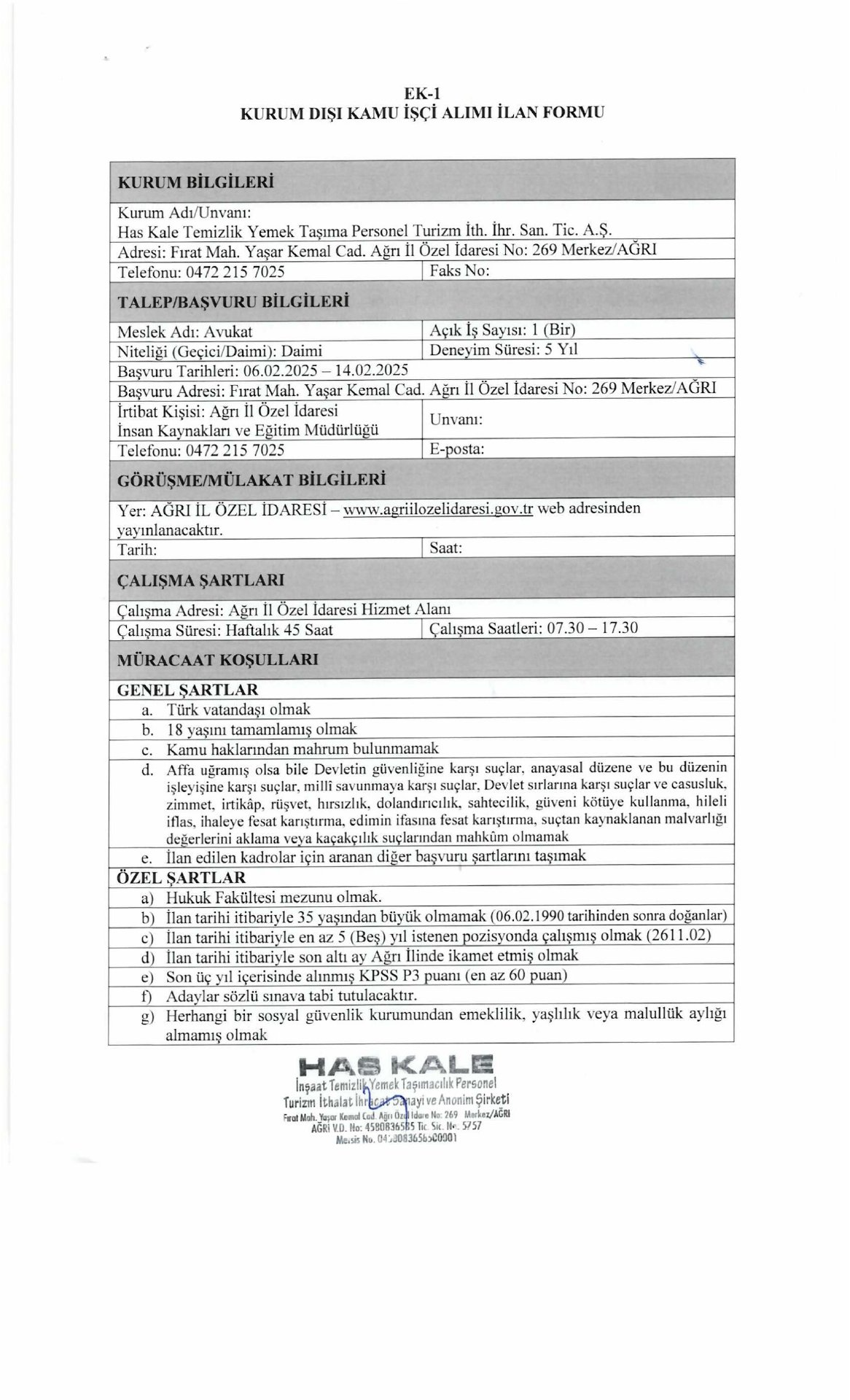 Ağrı Has Kale Temizlik 1 İşçi Alacak. Son başvuru tarihi 14 şubat 2025