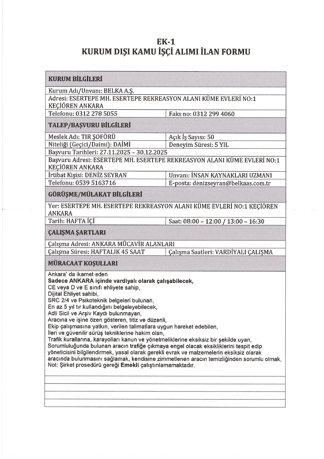 Ankara Belka AŞ. 50 İşçi Alacak. Son başvuru tarihi 30 Aralık 2025
