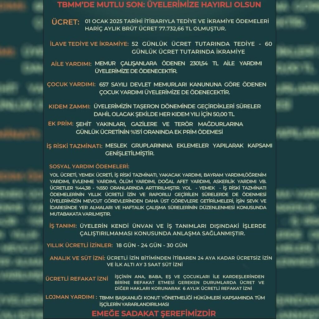 TBMM’de görev yapan kamu işçileri adına imzalanan 2025 yılı toplu iş sözleşmesiyle birlikte;