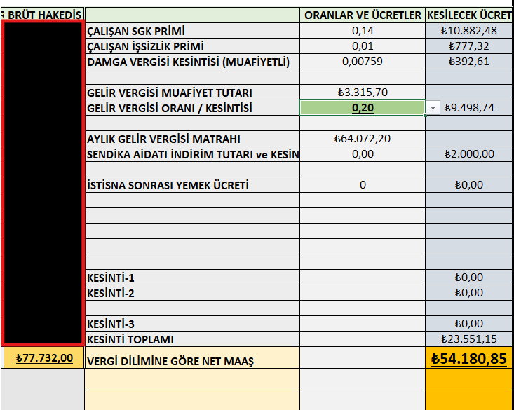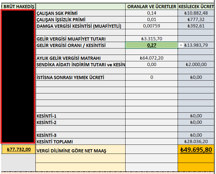 Not: Sendika aidatı yevmiye ile ilgili olduğu için ve yetkili sendika toplu sözleşmenin ayrıntılarını ve geçerli yevmiyeyi henüz net ilan etmediğinden, işçinin eline brüt geçecek 77.732₺ üzerinden hesaplama yapılmıştır. Bu sebep ile sendika aidat kesintisi yaklaşık rakam olarak girilmiştir.