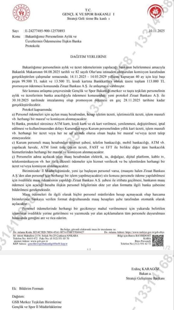 Gençlik ve Spor Bakanlığı (GSB) personeli için yeni banka promosyon anlaşması tamamlandı. Bakanlık ile Ziraat Bankası arasında imzalanan protokol kapsamında personellere toplam 113.000 TL tutarında promosyon ödemesi yapılacak.