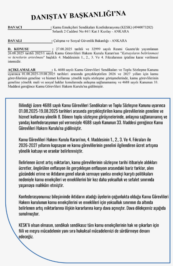 Kamu Emekçileri Sendikaları Konfederasyonu (KESK), 8. Dönem Toplu Sözleşme sürecinde Kamu Görevlileri Hakem Kurulu tarafından alınan ücret artışı kararlarına karşı yargı yoluna başvurdu.