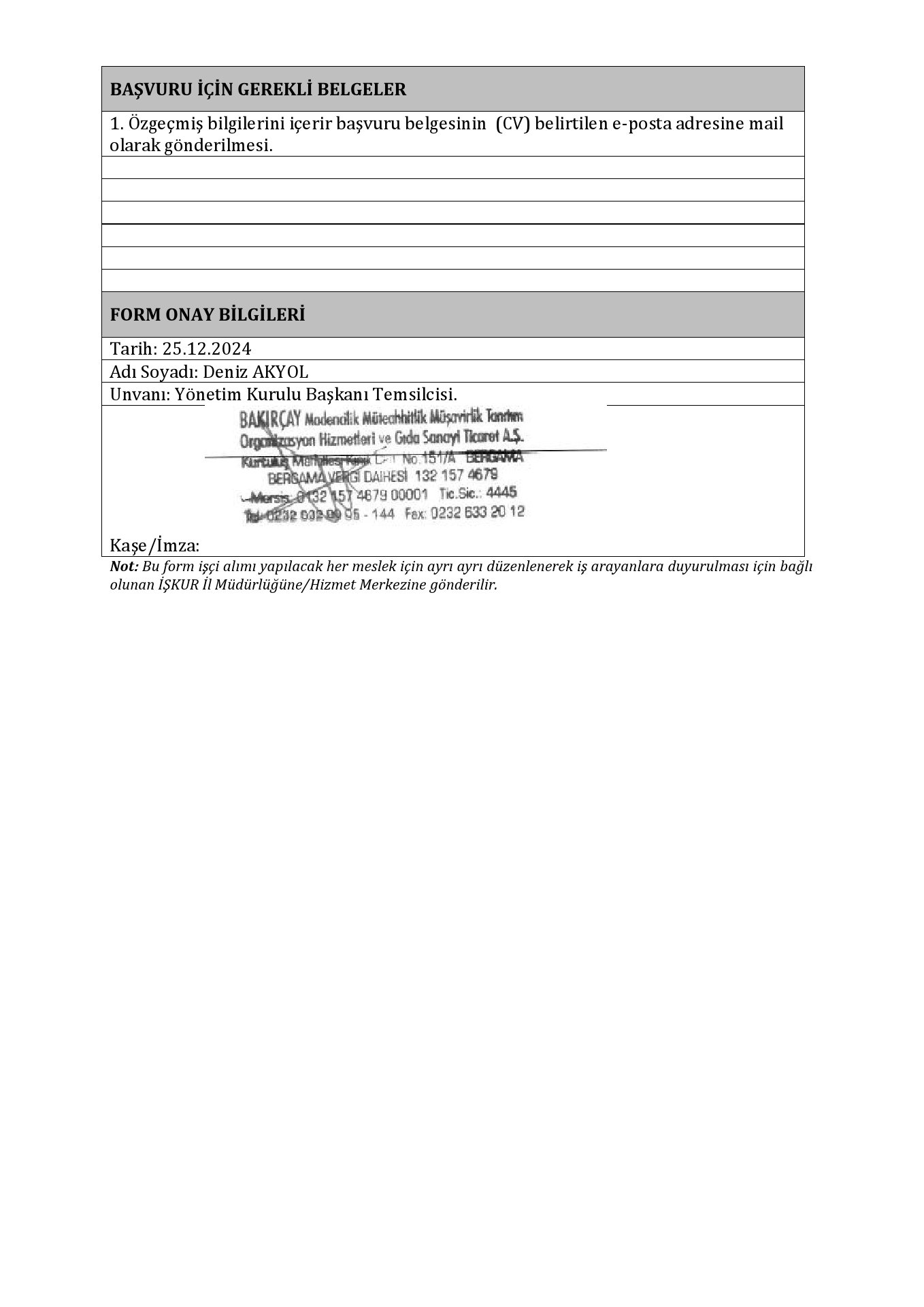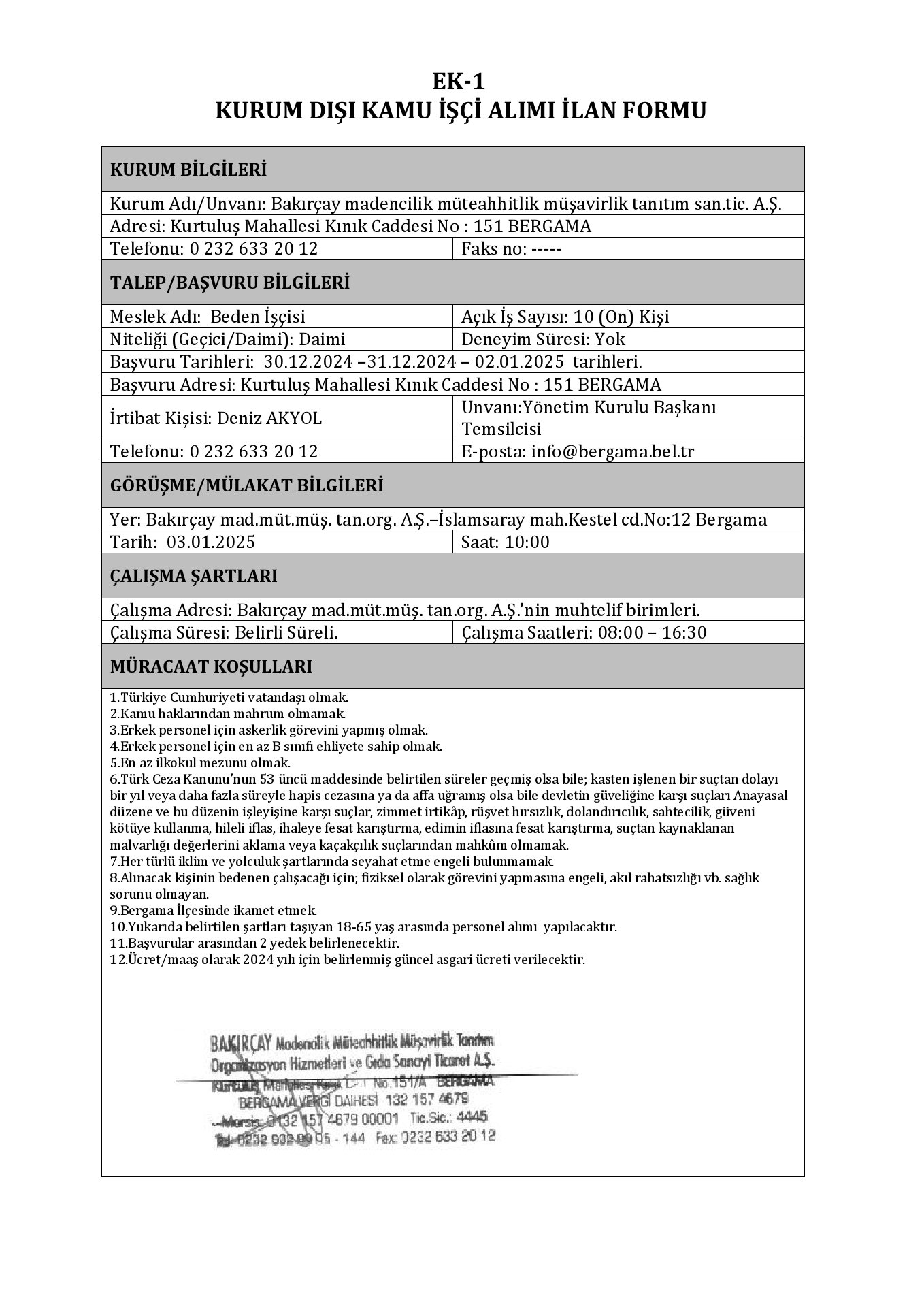 İzmir Bakırçay Madencilik 10 İşçi Alacak. Son başvuru tarihi 2 ocak 2025