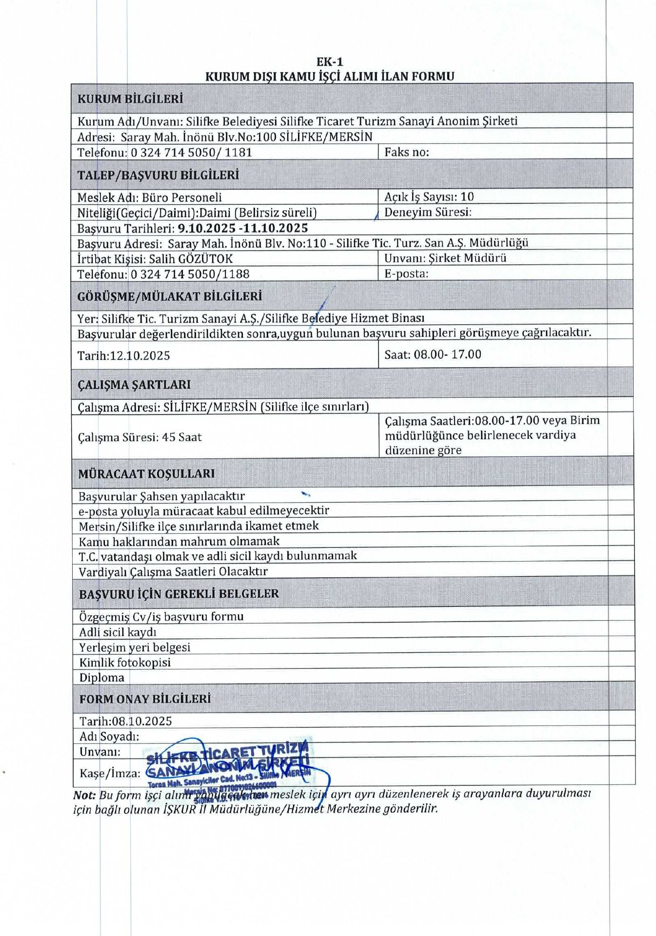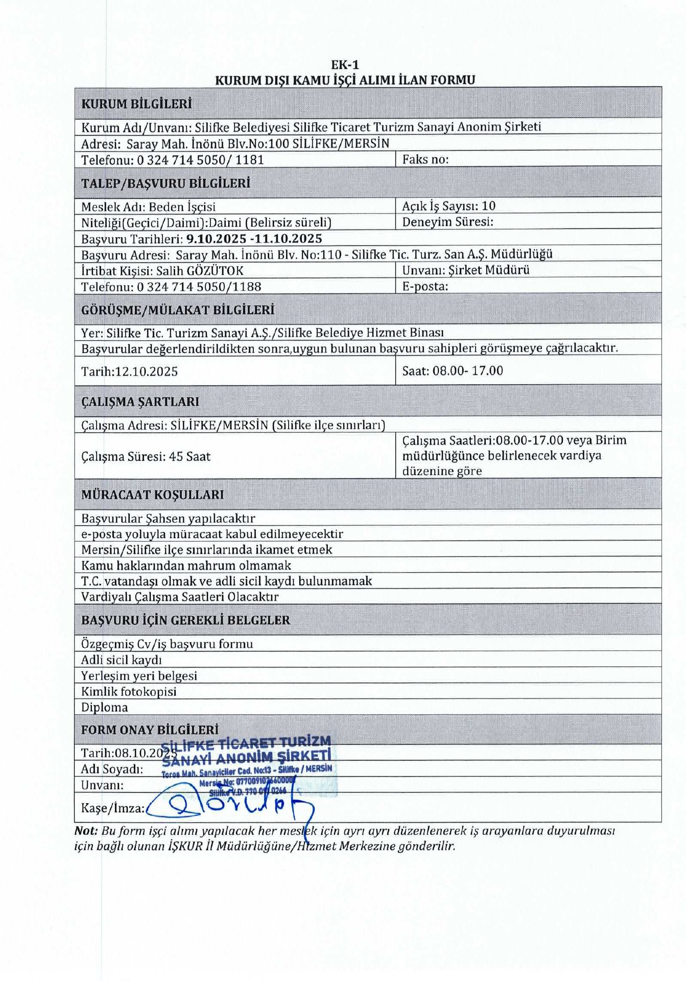 Mersin Silifke Belediyesi 20 İşçi Alacak. Son başvuru tarihi 11 Ekim 2025