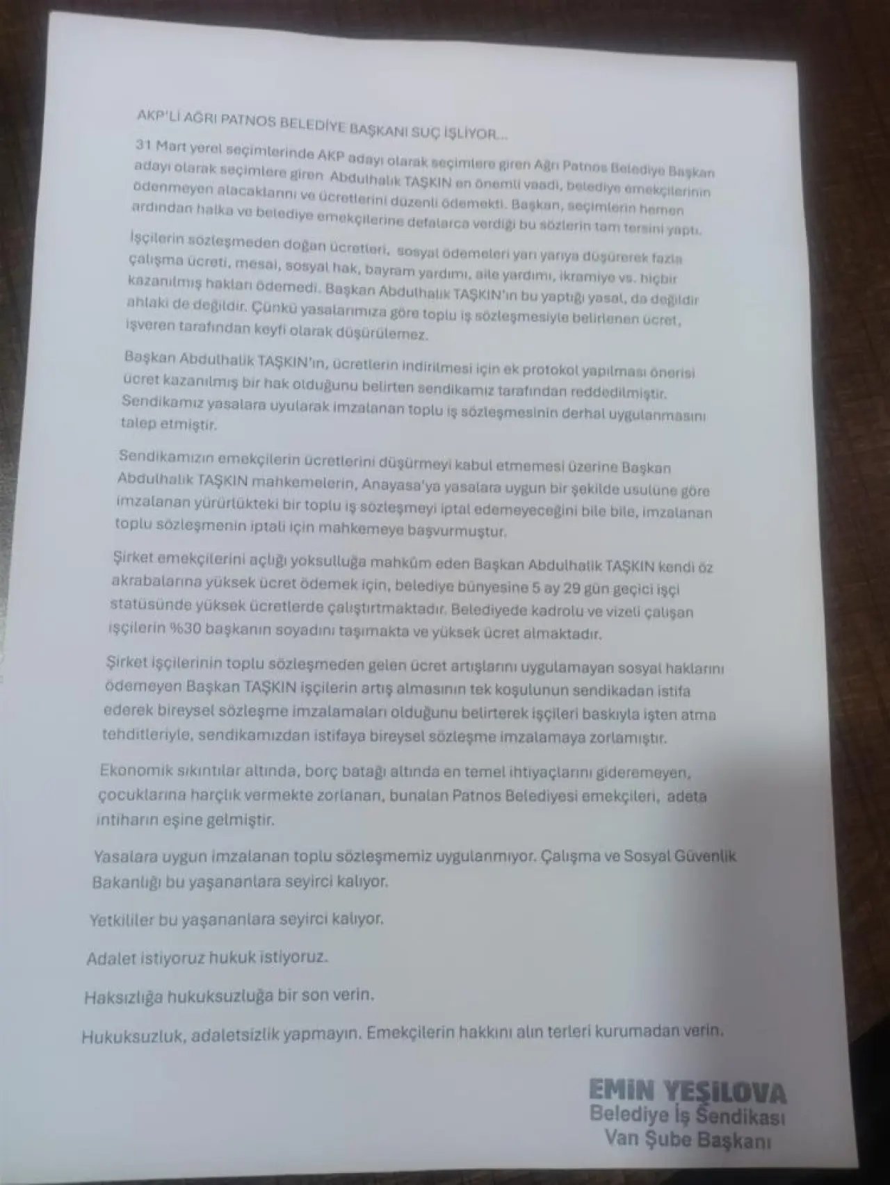 Patnos Belediyesi işçileri, toplu iş sözleşmesinden doğan haklarının tam olarak ödenmediğini ve sosyal yardımlar ile ek ödemelerin kesildiğini belirtti. İşçiler, maaşlarının düşürülmesine yönelik önerileri kabul etmeyerek, mevcut sözleşmenin uygulanmasını talep etti. Yeni işe alınan geçici işçilerin yüksek maaşlarla çalıştırılmasına rağmen, mevcut işçilere hakları ödenmiyor.