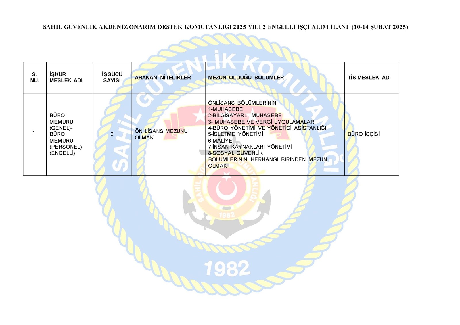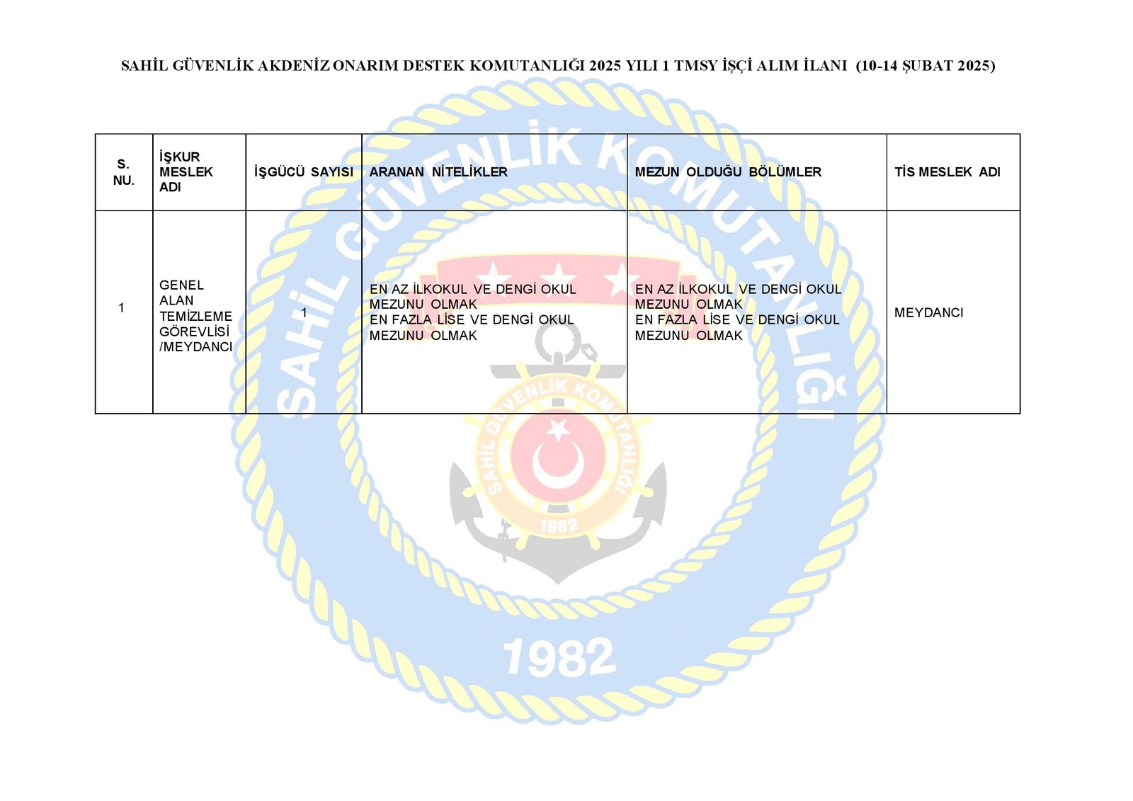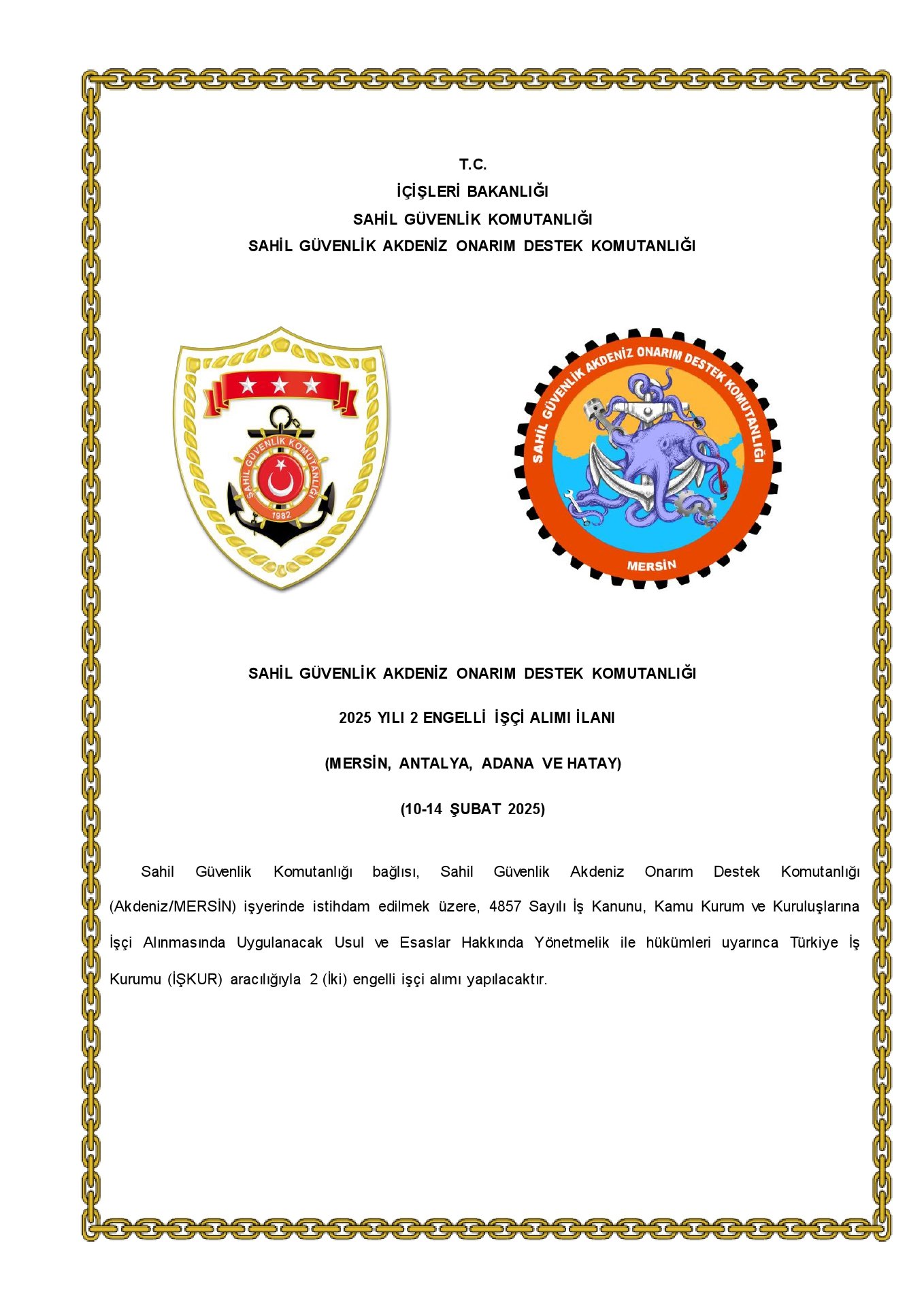 1- Türkiye İş Kurumu tarafından gönderilen nihai listede kimlik bilgileri bulunan adayların belge kontrolü, 24-25 Şubat 2025 tarihleri arasında saat 08.30-17.00 saatleri arasında Üçocak Mahallesi 132. Cadde 33020 Limaniçi-Akdeniz/MERSİN Sahil Güvenlik Akdeniz Onarım Destek Komutanlığı adresinde yapılacaktır. Adayların belge kontrol faaliyetine şahsen başvurmaları gerekmektedir. Bu duyuru tebliğ mahiyetinde olup, adayların adresine ayrıca posta yoluyla ayrıca tebligat yapılmayacaktır.