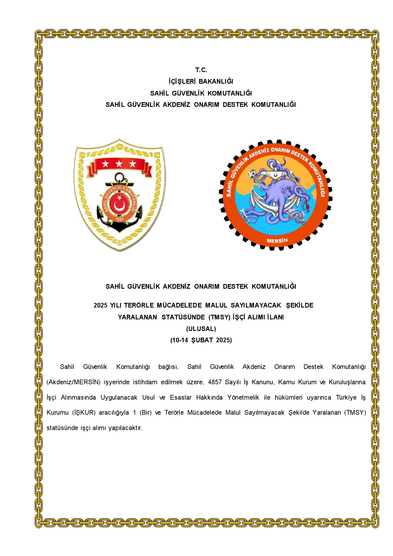 2- Türkiye İş Kurumu (İŞKUR) tarafından gönderilen listelerde yer alan adaylar arasından Kura çekimi Üçocak Mahallesi 132. Cadde 33020 Limaniçi-Akdeniz/MERSİN Sahil Güvenlik Akdeniz Onarım Destek Komutanlığı adresinde 20 Şubat 2025 Perşembe günü saat 09.30’da noter huzurunda yapılacaktır. Kura neticesinde belirlenen sözlü/uygulamalı sınava girmeye hak kazanan adaylara ait liste Sahil Güvenlik Komutanlığı resmi internet örün sayfasında (www.sg.gov.tr) yayımlanacaktır. Bu duyuru tebliğ mahiyetinde olup, adayların adresine ayrıca posta yoluyla ayrıca tebligat yapılmayacaktır.