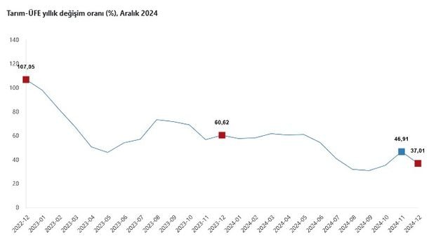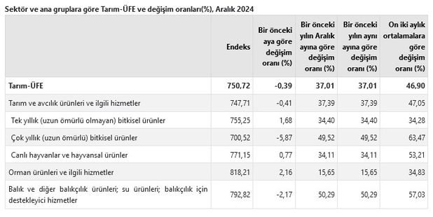 Tarım-ÜFE’de, 2024 yılı Aralık ayında bir önceki aya göre yüzde 0,39 azalış, bir önceki yılın Aralık ayına göre yüzde 37,01 artış, bir önceki yılın aynı ayına göre yüzde 37,01 artış ve on iki aylık ortalamalara göre yüzde 46,90 artış gerçekleşti.