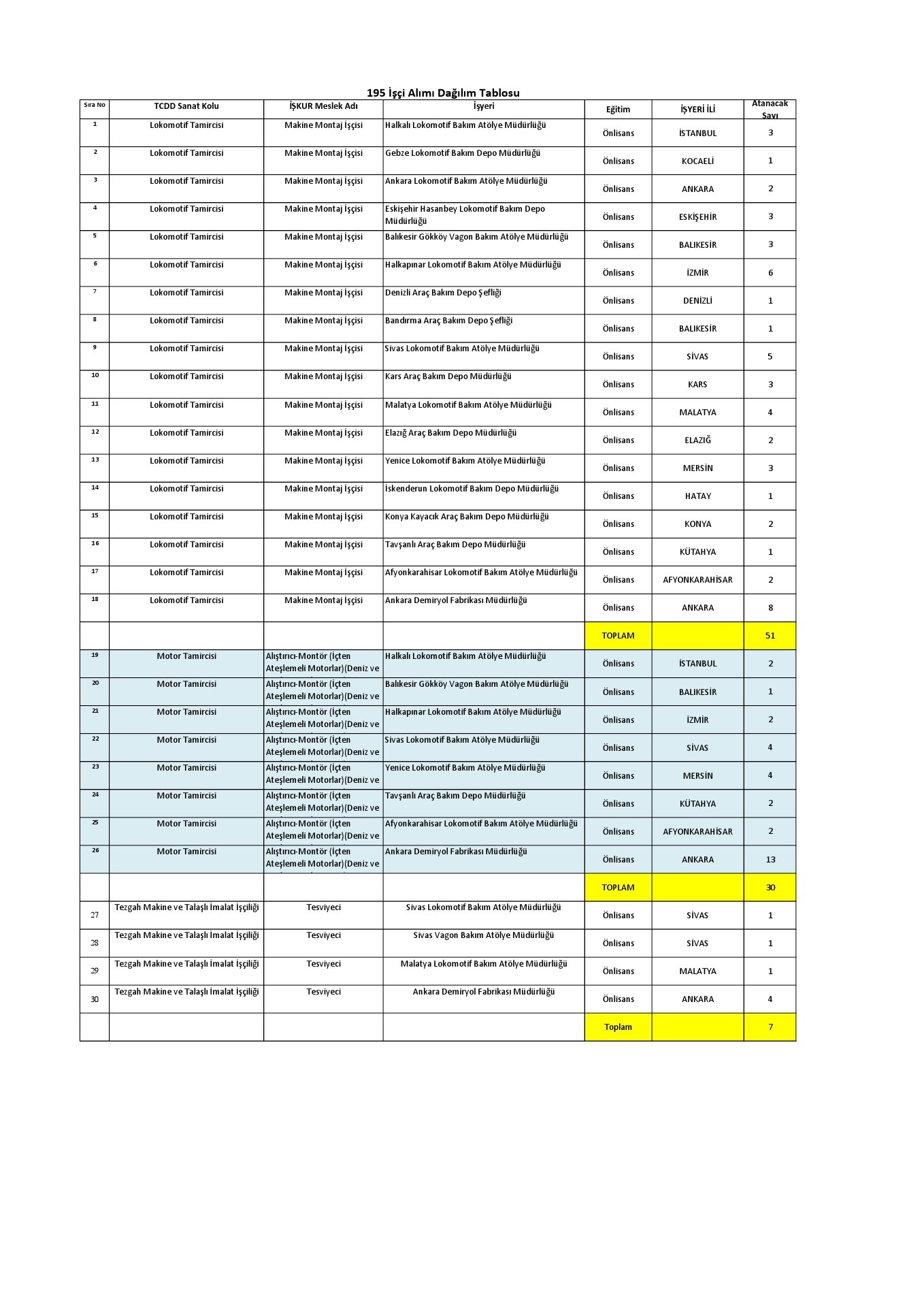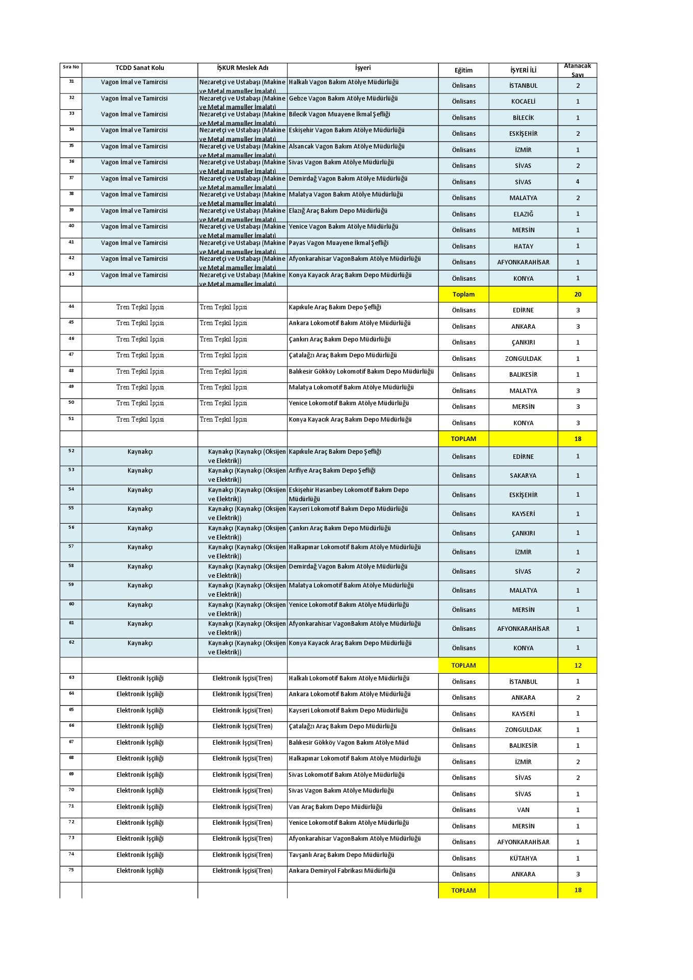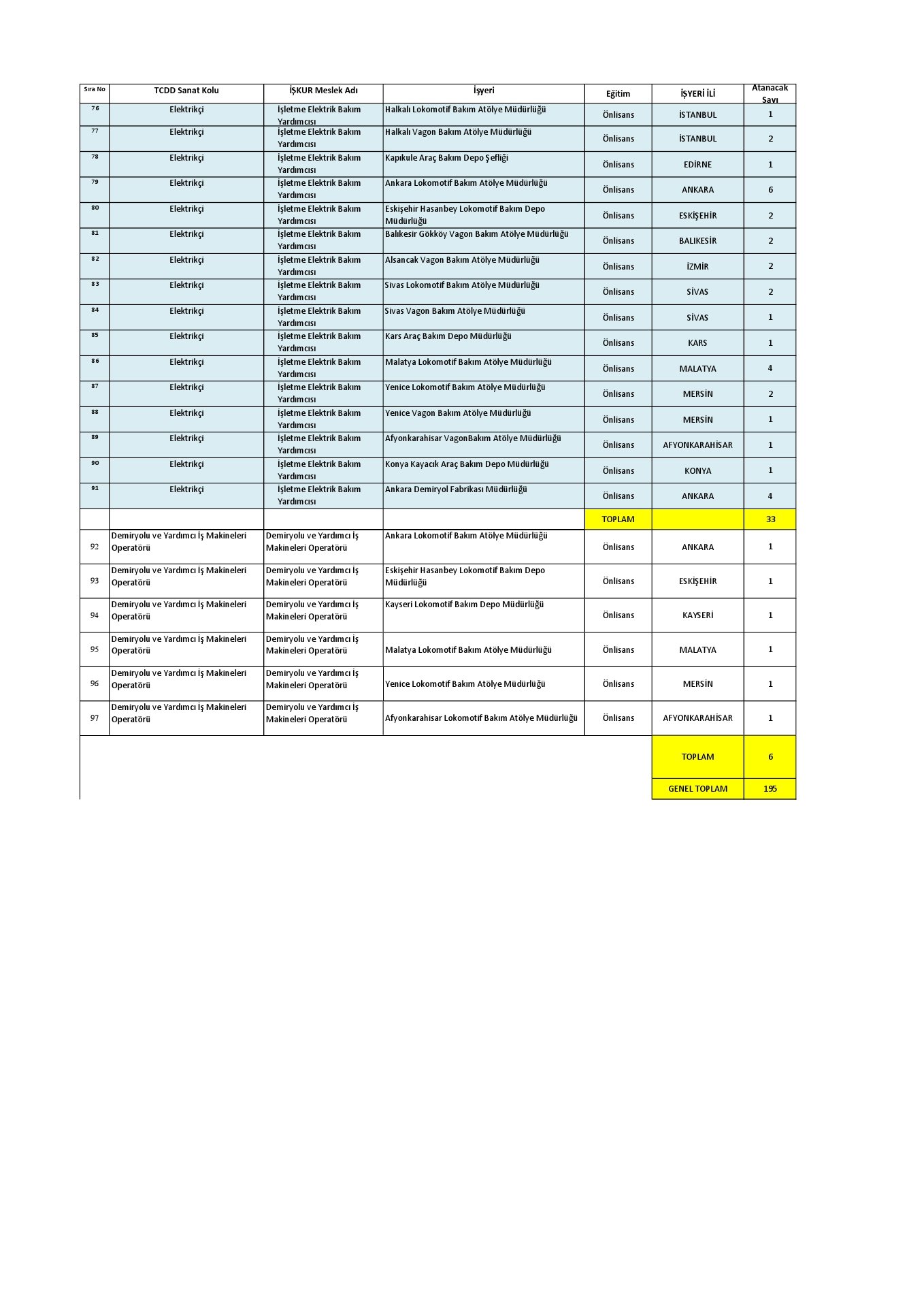 * Sözlü sınav sonucunda Tren Teşkil İşçisi olmaya hak kazananlardan A Grubu unvanlarda çalışır ibareli sağlık kurul raporu istenecektir. Diğer unvanları kazananlardan Ağır ve Tehlikeli İşler Sınıfında tanımlanan işlerde çalışabilir olduğunu belgeleyen sağlık raporu istenecektir.
